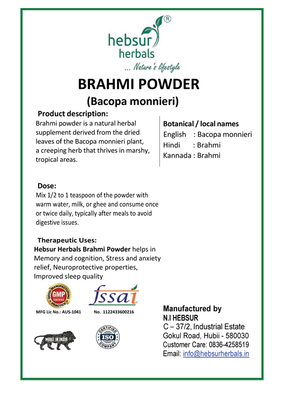 Brahmi Powder Helps Nourish The Roots Well And Accelerates Hair Growth By Thickening The Roots. Brahmi Also Helps To The Keep The Scalp Cool And Strengthens The Hair Follicles. Treats Split Ends * The Application Of Brahmi Powder Coats The Hair With Some Shine And Restores Its Lost Lustre. It Reduces The Chance Of Split Ends And Adds Volume And Bounce To The Hair Texture. Prevents Dandruff * Brahmi Possesses Exceptional Hair Moisturising Properties. This Helps Solve Dry Scalp Issues, Including Itchiness And Dandruff, As It Nourishes The Scalp Well. While Brahmi has been proven to be very effective for improving memory; a large section of people use Brahmi powder for hair growth.