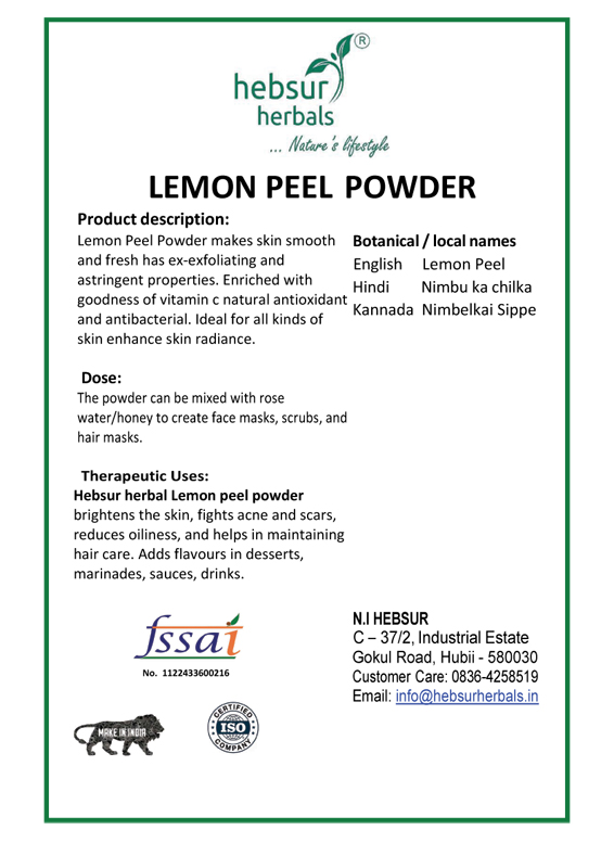 Lemon Peel Powder makes skin smooth and fresh has ex-exfoliating and astringent properties. Enriched with goodness of vitamin c natural antioxidant and antibacterial. Ideal for all kinds of skin enhance skin radiance. Removes toxic elements and dirt from skin directions- mix 2-3 spoons of lemon peel powder in water to create a paste. Apply thoroughly over the skin as you do with face pack, let it dry and wash with cold water.